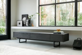 Möchtest du mit Stil fernsehen? Das Sideboard MODALI in der Farbe Natur ist das perfekte TV-Möbel für jede moderne Einrichtung. MODALI ist 237 cm lang und hat 1 Schublade und 2 Klappen, hinter denen du deine Sachen verstauen kannst. Das Möbel ist aus Eichenfurnier und steht auf schwarzen Metallbeinen. Auch in der Farbe Onyx erhältlich!