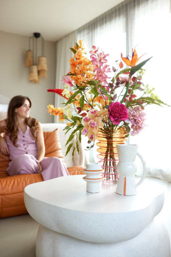 Orange ist zurück im Interieur, aber viel dezenter als in den 1970er Jahren. Knallige orangefarbene Wände und Möbel haben Platz gemacht für weiche Farbakzente. Die NORA-Serie von COCOmaison ist ein gutes Beispiel dafür. Die Vase und der Kerzenständer bilden ein schönes Set, aber natürlich kannst du sie auch einzeln hinstellen. Diese Vase ist 26 cm groß, ihr Fuß ist geribbelt und sie hat einen eleganten Henkel. Stelle ein paar Zweige oder einen hübschen Blumenstrauß hinein und dein Haus bekommt sofort einen sonnigen und sommerlichen Look.